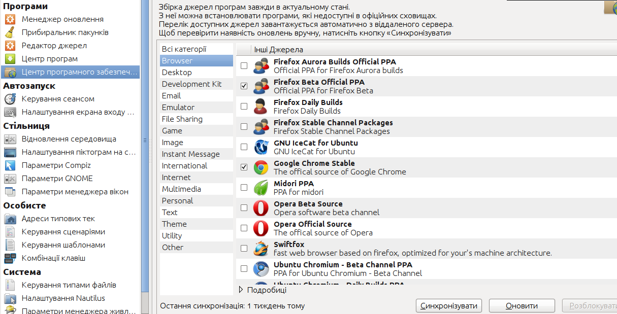 Браузер- я використовую Firefox 9.0 але Хром теж дуже непоганий, на ваш вибір.Найшвидше їх встановити можна додавши відповідний репозитарій через програму Ubuntu Tweak